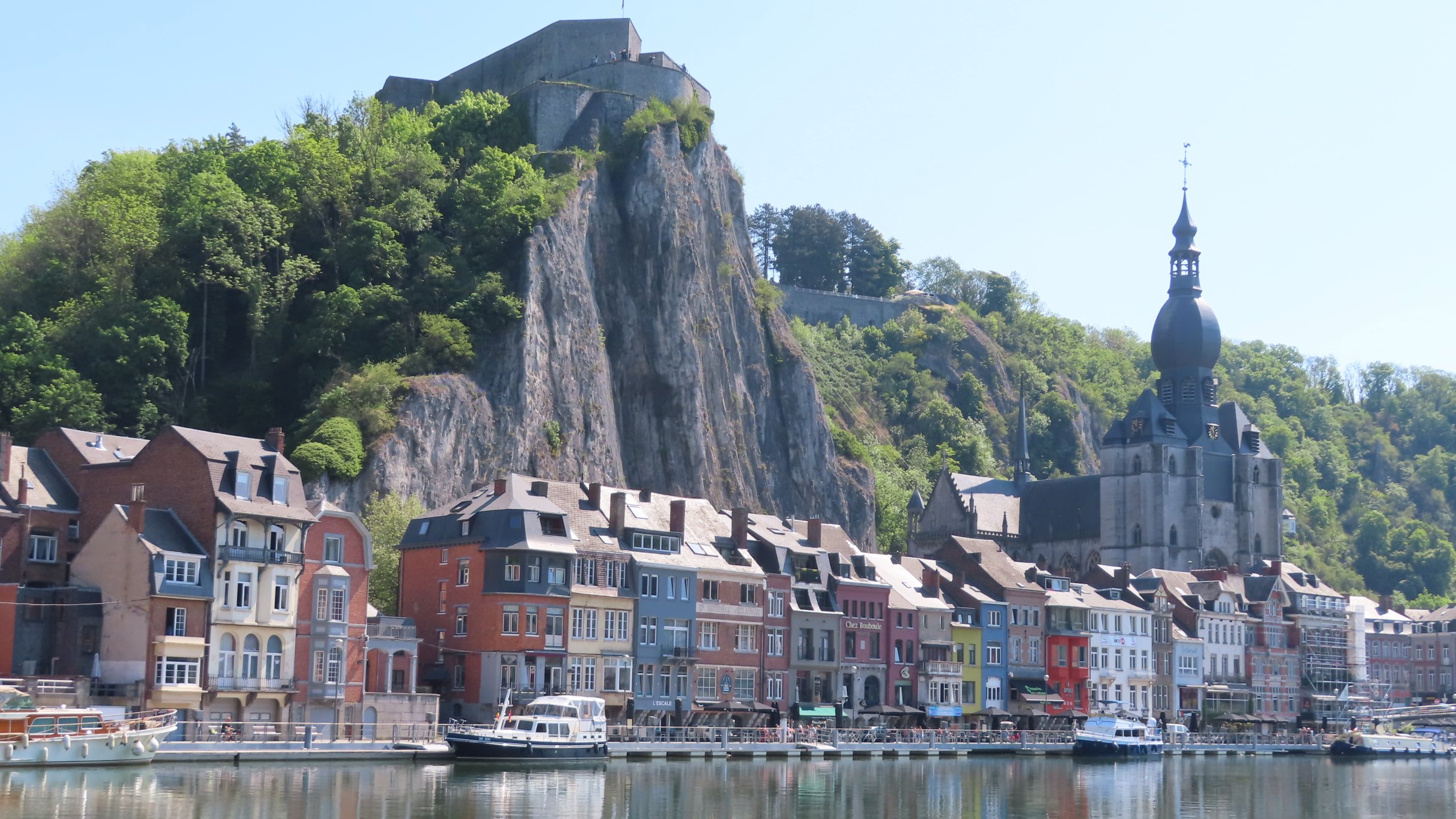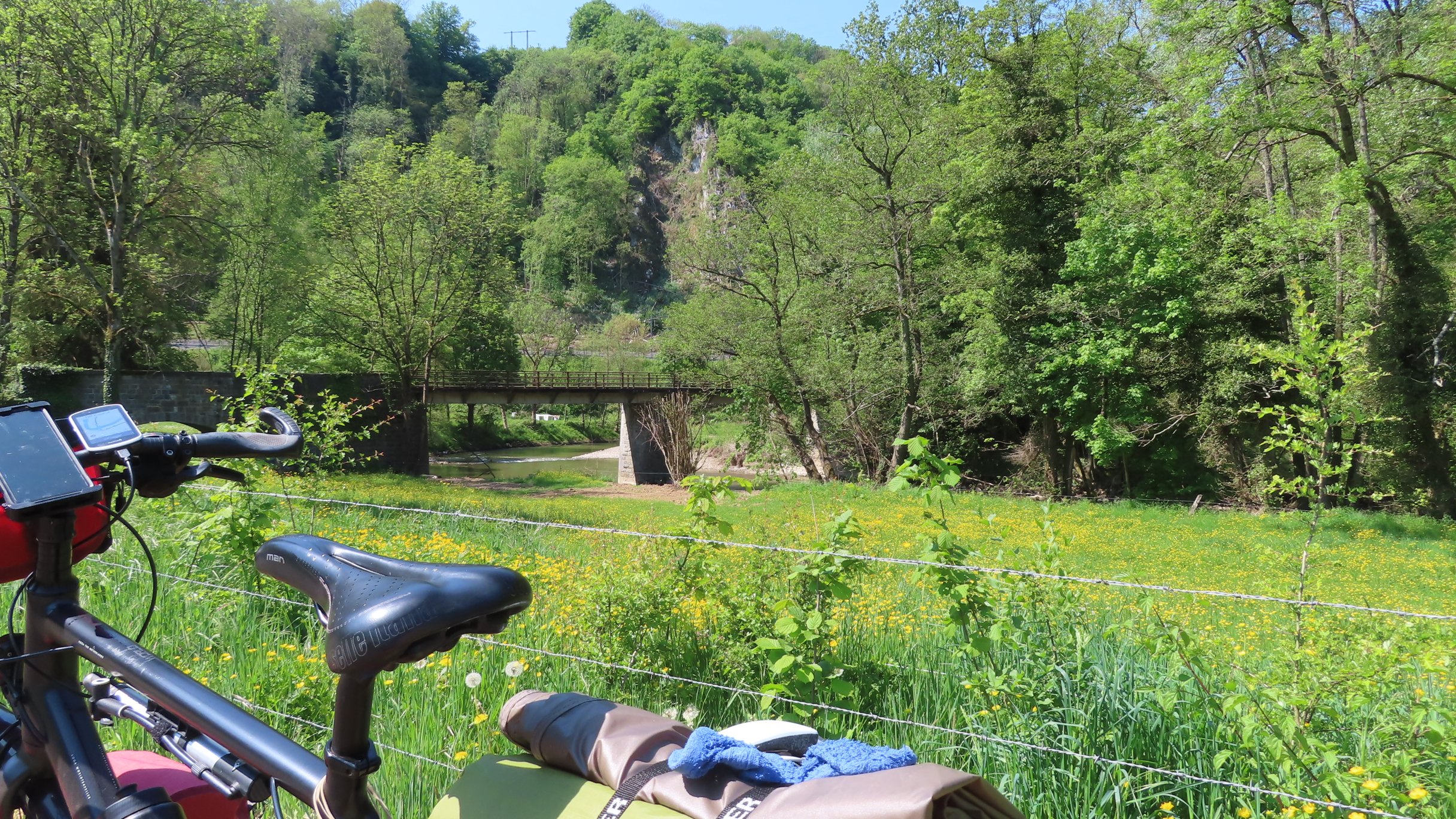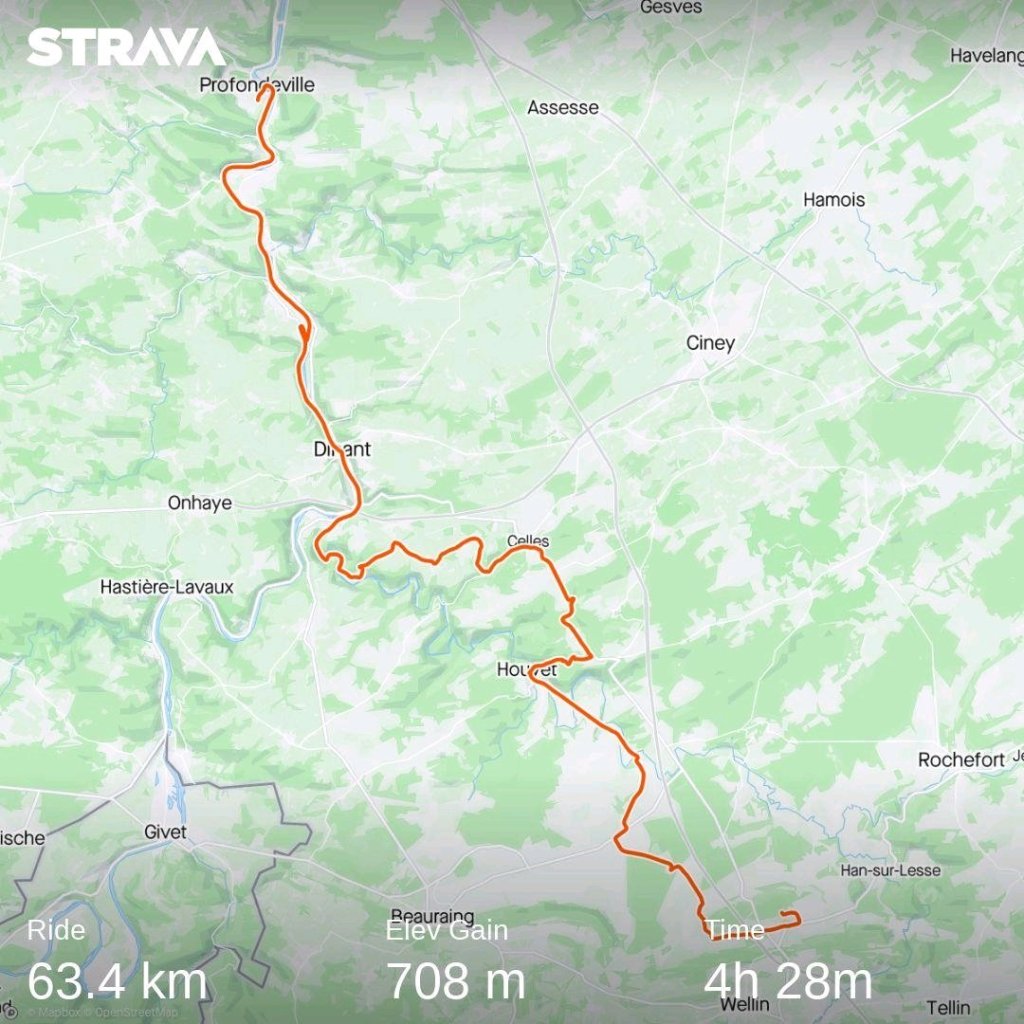 Profondefille: Rijstroken niet naast elkaar, maar boven elkaarHoux: Omleiding richting Dinant Dinant: Links boven citadel van DinantEven na Dinant: Maasroute gaat rechtsaf, ik ga nu linksafRichting Walzin: Bruggetje over de LesseFurfooz: Een filmploeg in actie Furfooz: Koolzaad veldenKoolzaadFurfooz: Gewoon maar een boerderij Veves: Chateau de VevesSanzinnes: 2 km afdalen, maar gevaarlijk Houyet: Tunnel de Hour (500m)Ave et Auffe: Camping Roptai (Euro 11,50)