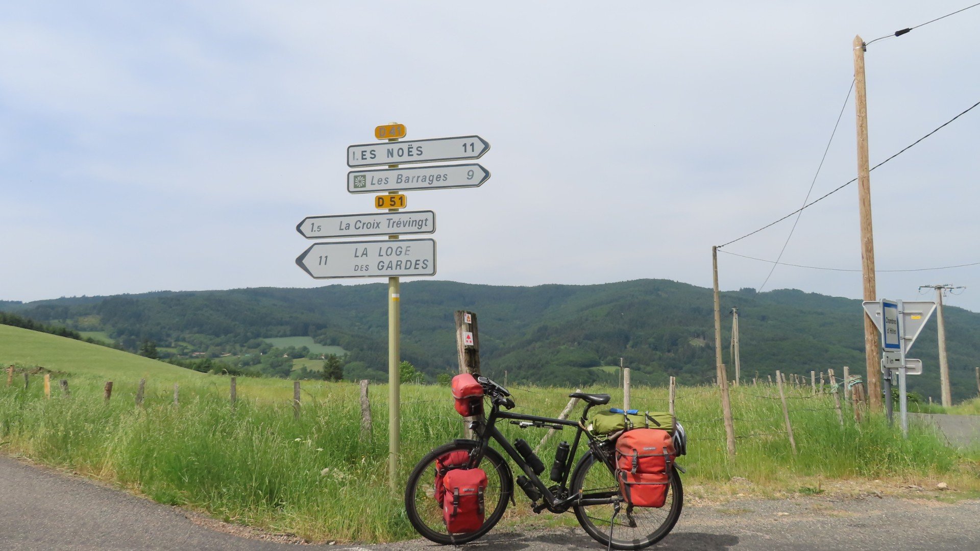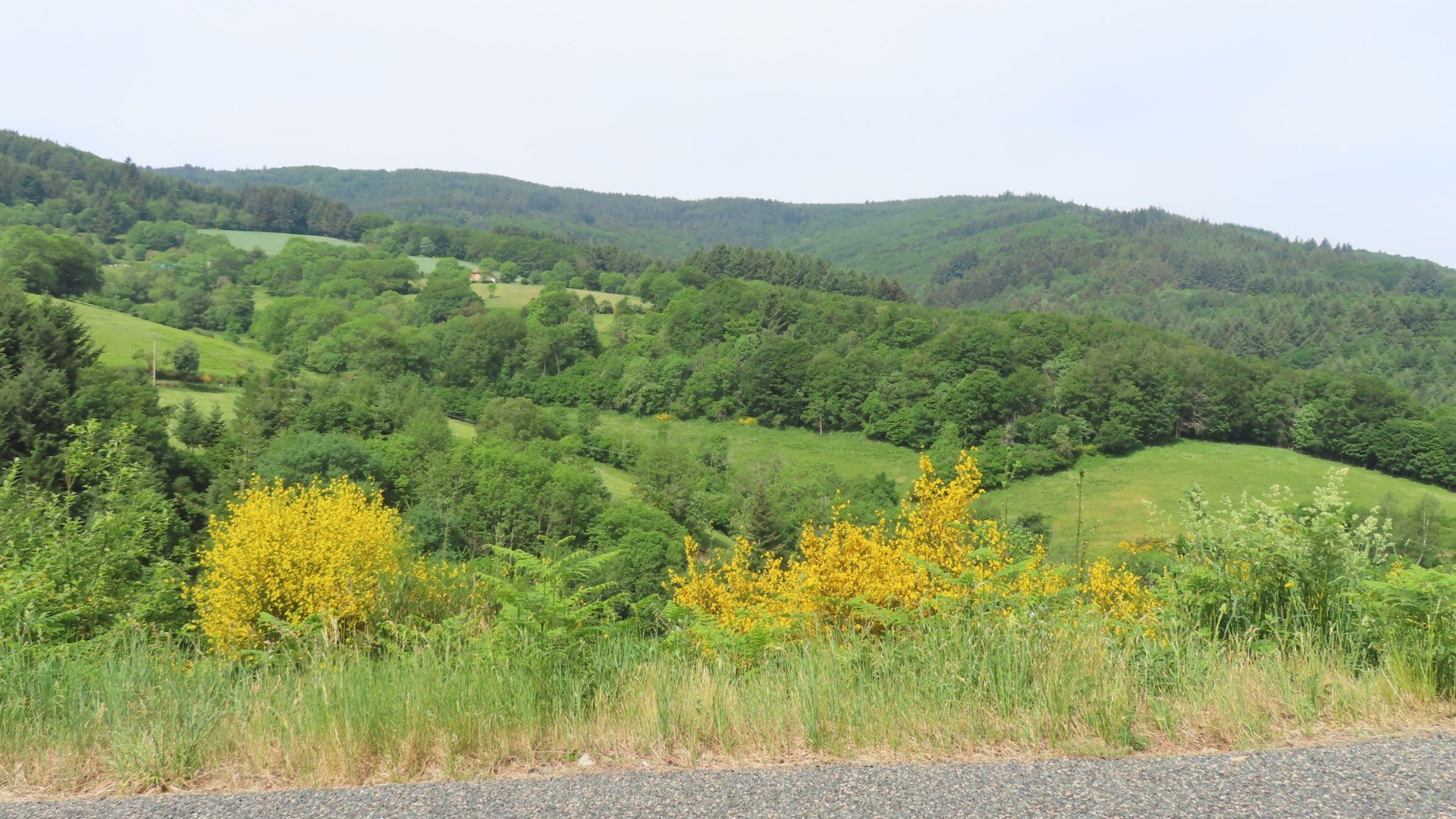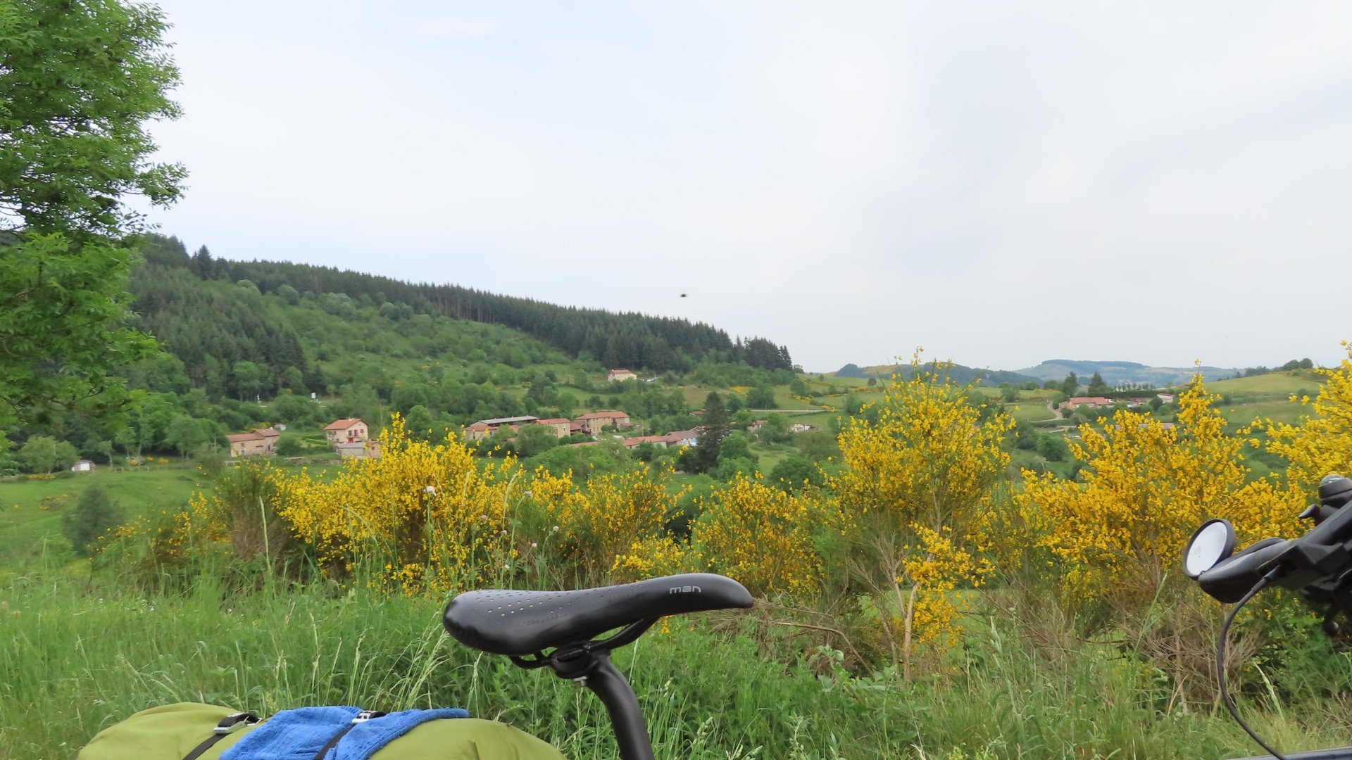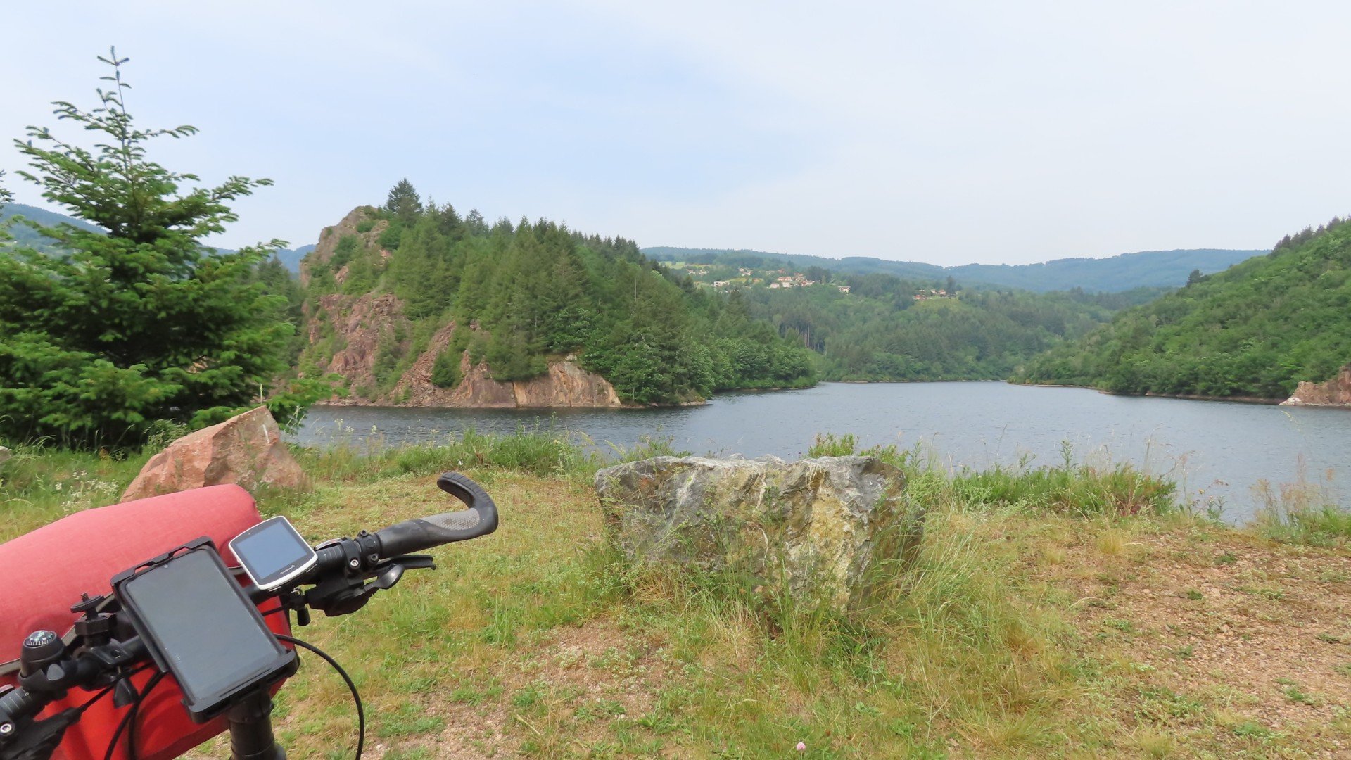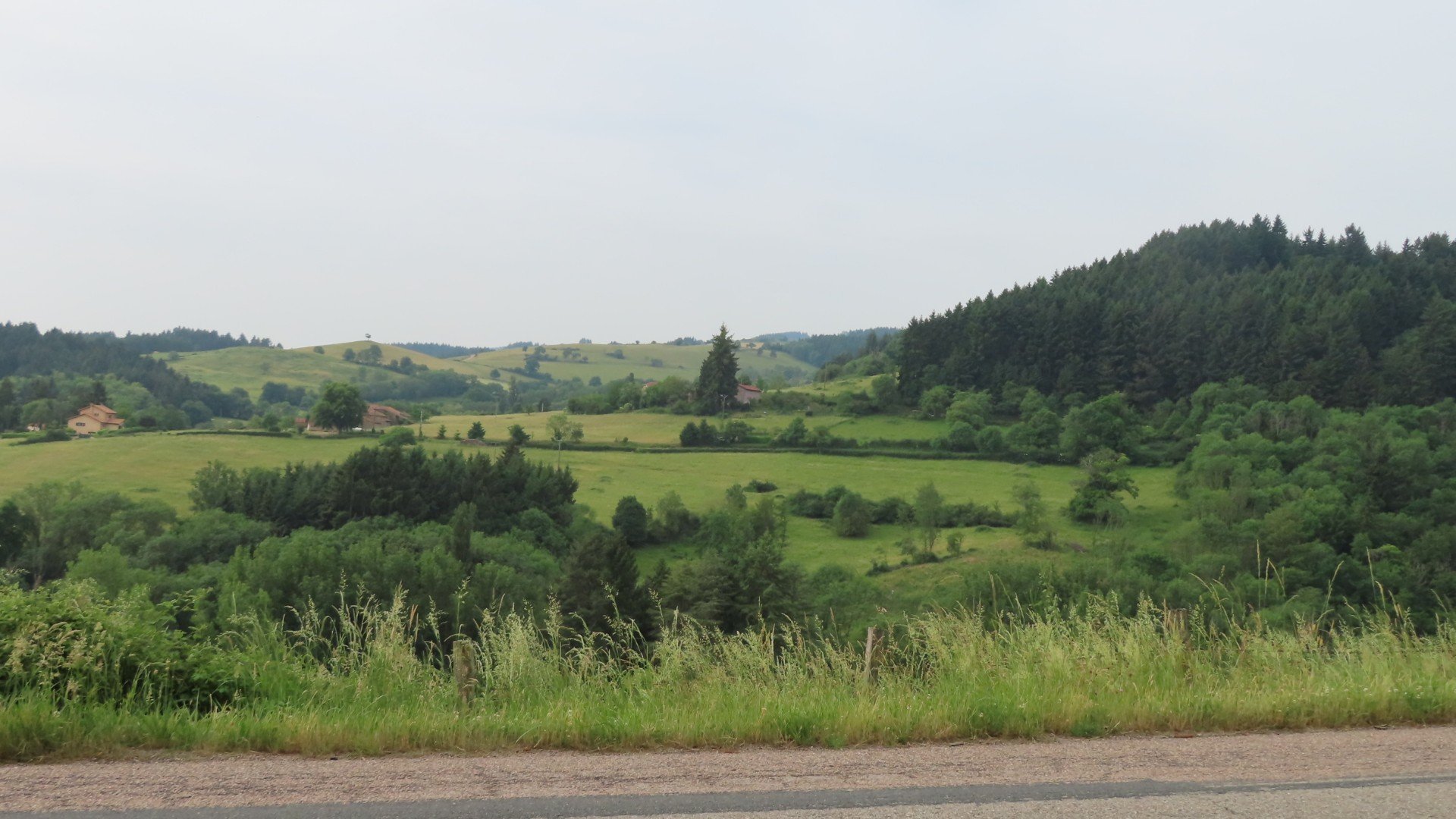 Mably: Muurschildering met witte koeienDeze weg na de top nemen we dus niet. We nemen een veel rustiger en steiler weggetje Het dorpje Arcon in de verteRenaison: StuwmeerHet stuwmeerOnderweg naar La Croix Trevingt Nog een fotoEn nog maar weer een. Nog 1.5 kmEven voor La Croix TrevingtLa Croix Trevingt gehaald. Niets afdaling nog een paar honderd meter klimmenEen dorpje even na La Croix Trevingt In de verte autosnelweg A89Nog een klimmetje en we zijn in Noiretable Noiretable: Camping (Euro 5,20)