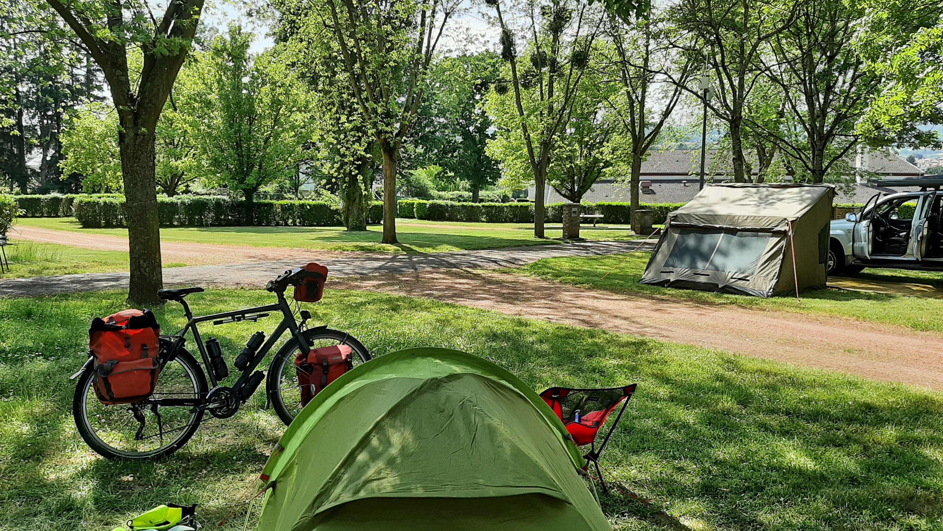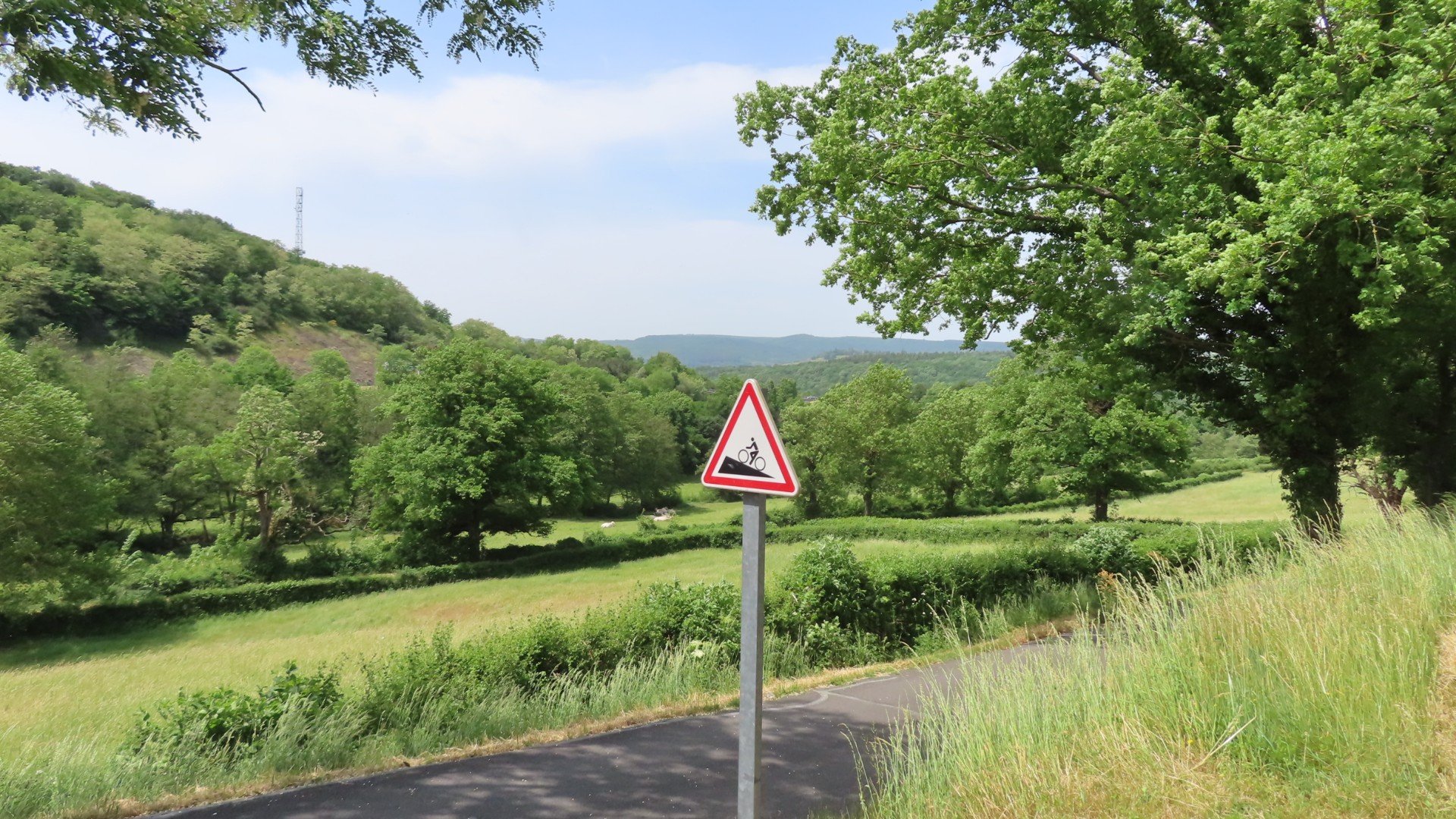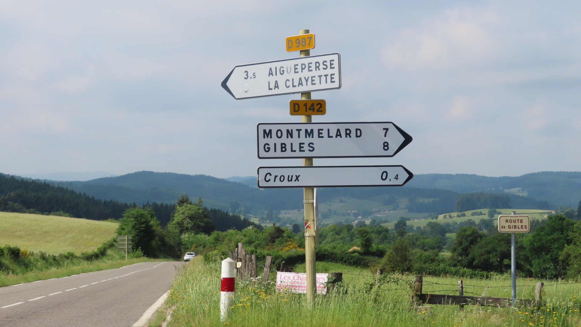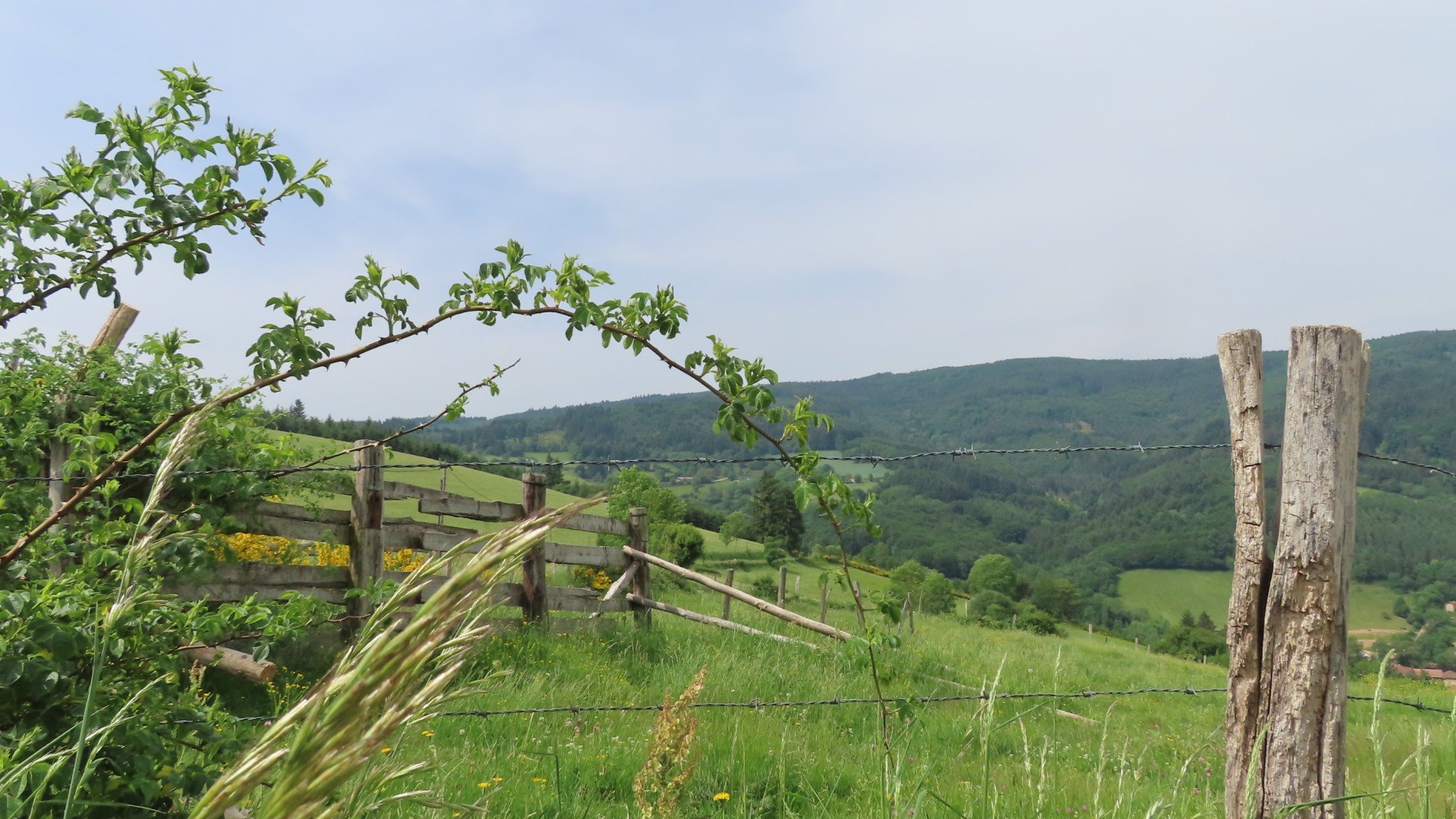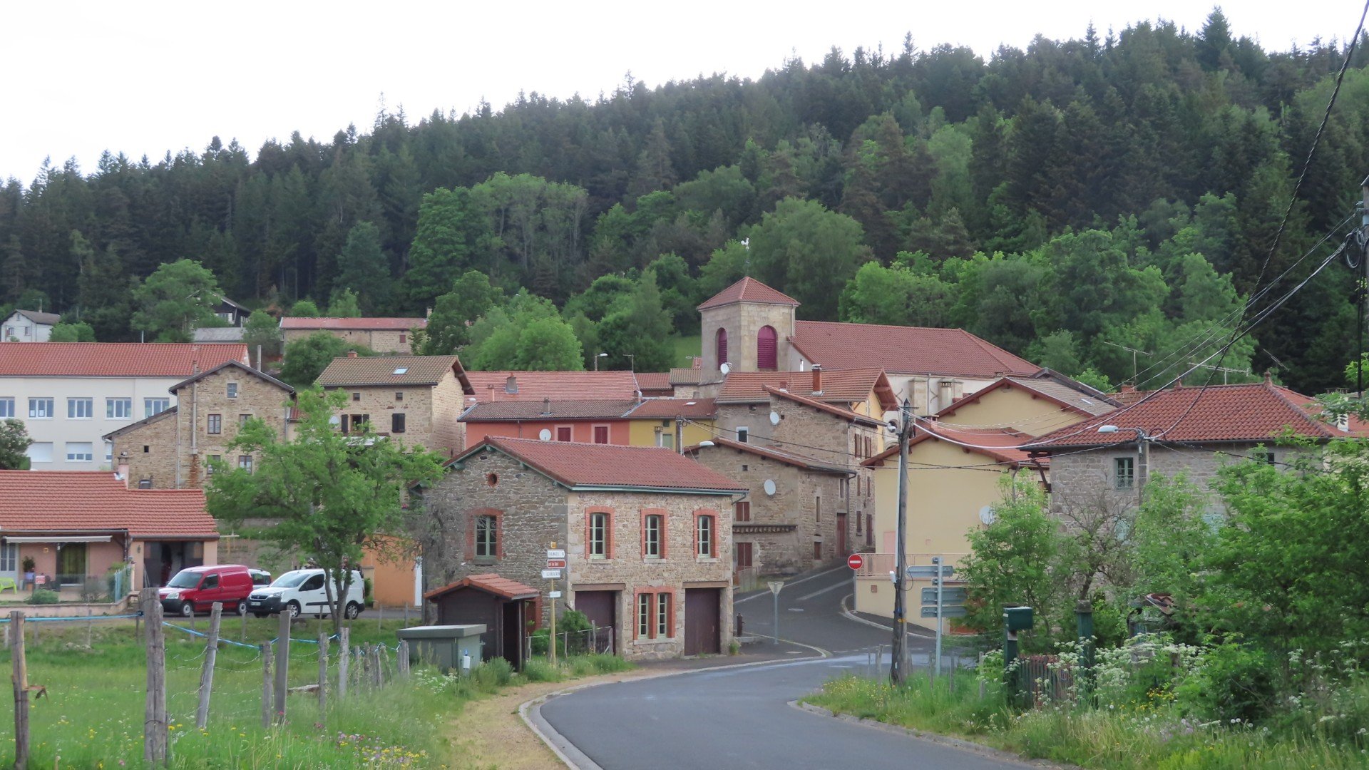 Mably: Muurschildering met witte koeienDeze weg na de top nemen we dus niet. We nemen een veel rustiger en steiler weggetje Het dorpje Arcon in de verteRenaison: StuwmeerHet stuwmeerOnderweg naar La Croix Trevingt Nog een fotoEn nog maar weer een. Nog 1.5 kmEven voor La Croix TrevingtLa Croix Trevingt gehaald. Niets afdaling nog een paar honderd meter klimmenEen dorpje even na La Croix Trevingt In de verte autosnelweg A89Nog een klimmetje en we zijn in Noiretable Noiretable: Camping (Euro 5,20)