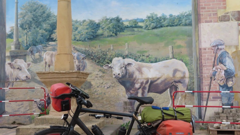 Puligny: Een oude druivenpers Puligny: Standbeeld in het centrumCorpeau: Man aan het werk in de wijngaardCorpeau: Waarschijnlijk zijn bromfietsFietsen langs Canal du CentreWeet niet meer waar dit isOok vandaag weer fietsen over een fietspad op de oude treinrailsHet regende ook weer een klein beetjeBuxy: Het oude treinstation van BuxyVanochtend de tent in de regen ingepakt Cormatin: Chateau CormatinIets voor Cluny. Koeien in het water. Het is warmCluny: Camping 2 nachten (Euro 18,90)