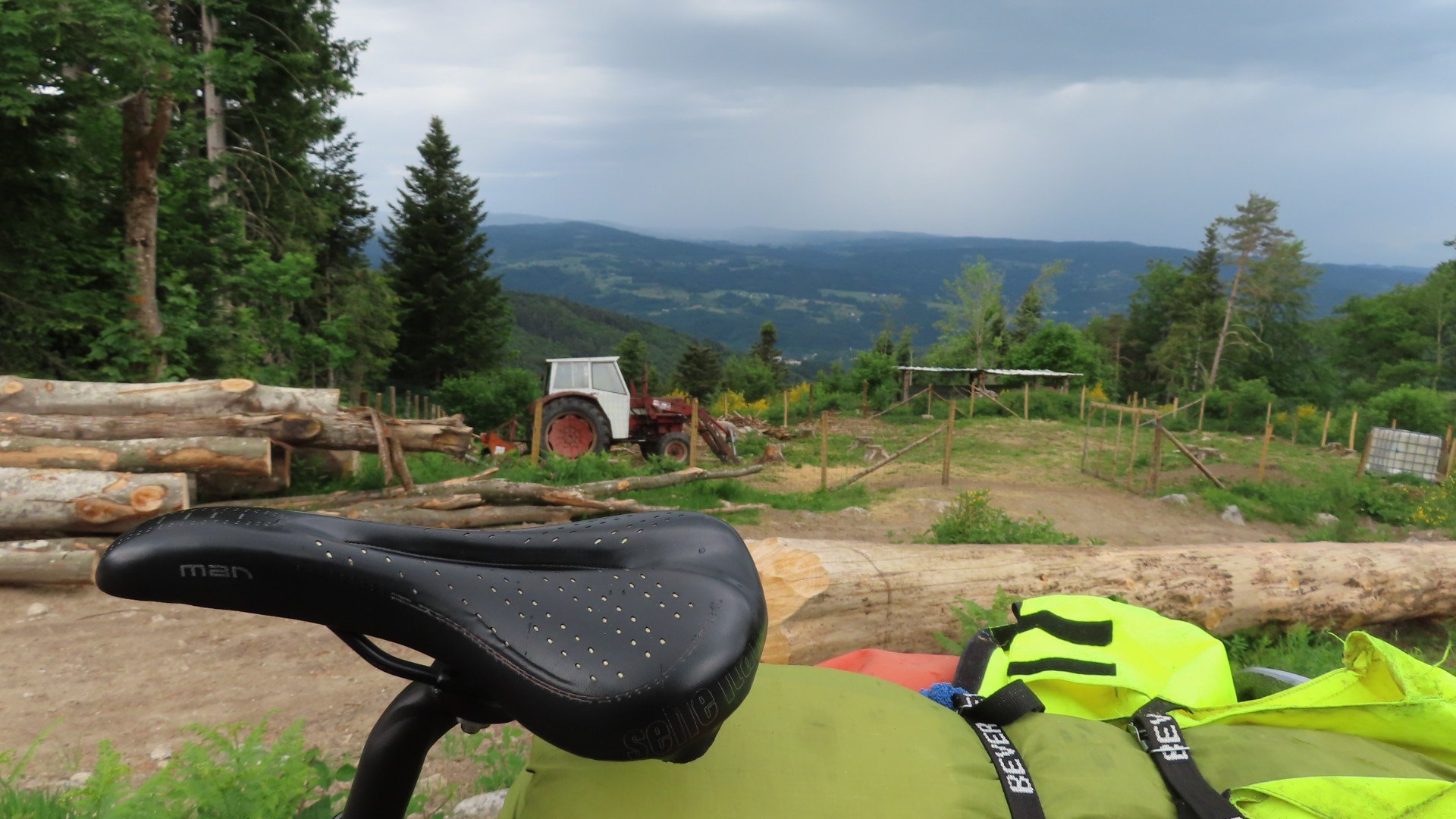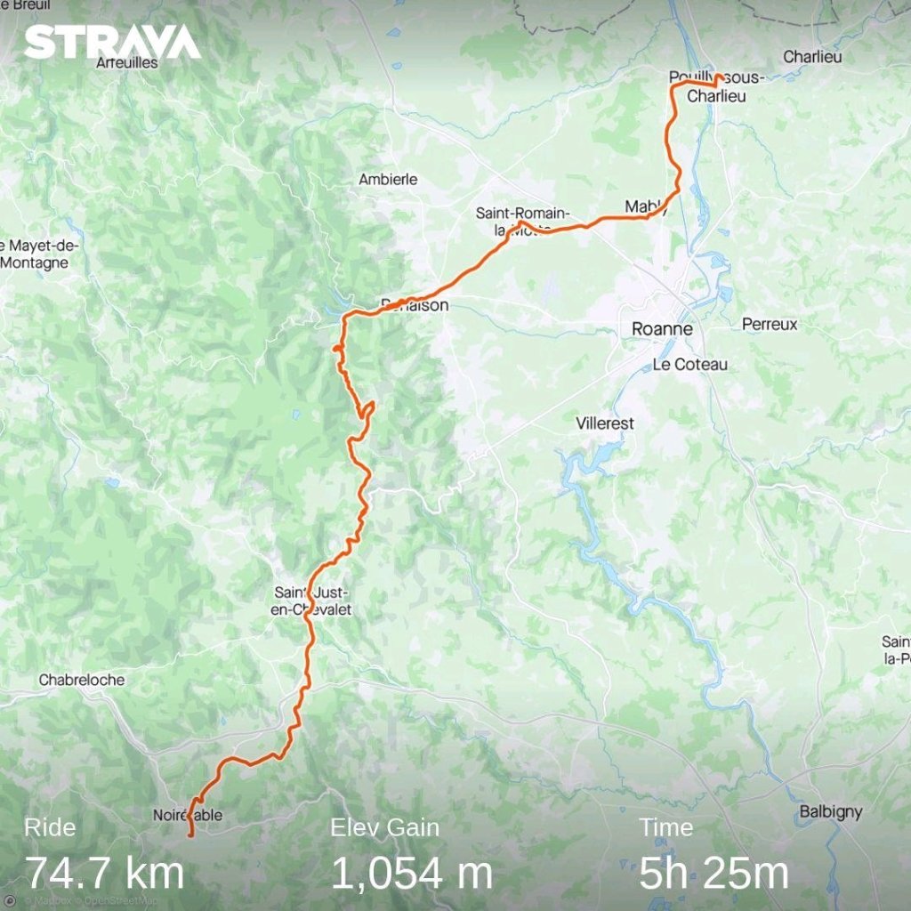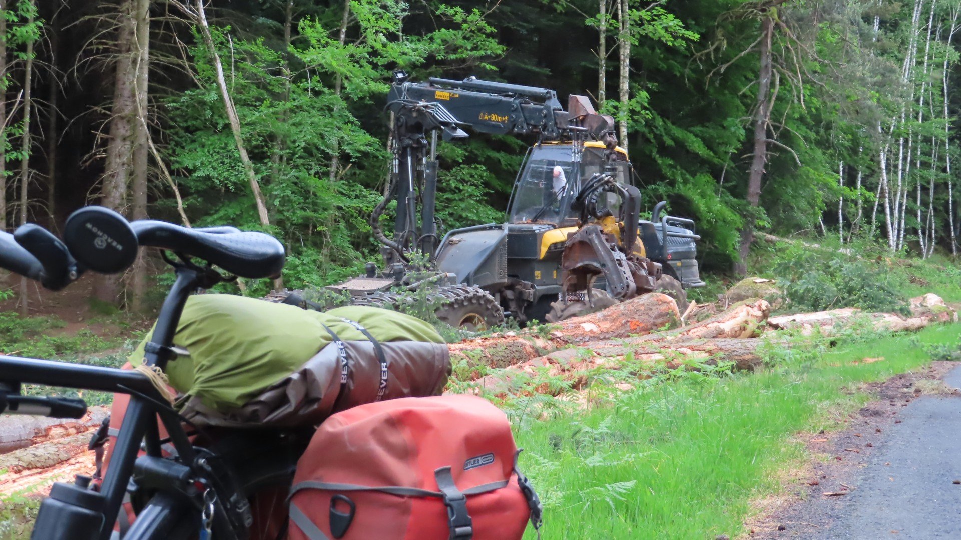Noiretable: Nog geen 500m of er moet alweer fors geklommen wordenOnderweg naar Farfournoux. Wel last van veel vliegenBoomkappen kan binnen 5 minuten incl. boom takken vrij mkenKlimmen en klimmenLe Trevy: Bruin, zwart en wit paardIn de verte donkere wolken. We zien wel wat er komtNog een paar meter en we zijn bovenSaint Pierre la Bourthonne: We zijn bovenEr volgt een kilometers lange afdalingBomen genoeg die eventueel gekapt kunnen wordenEen foto Chadernolles: Camping (Euro 14.00)